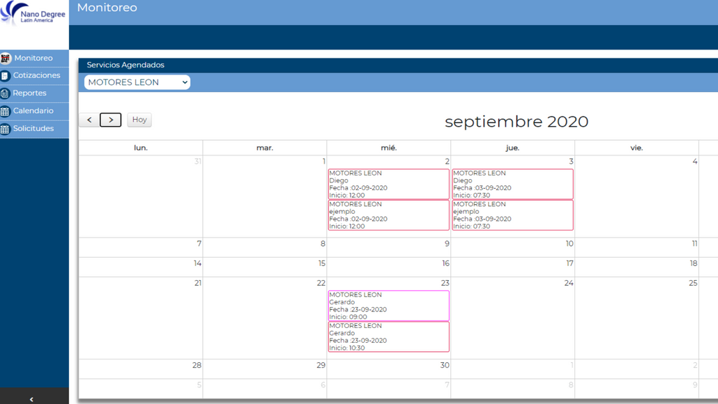 Calendario con la programación de servicios agendados por proveedor