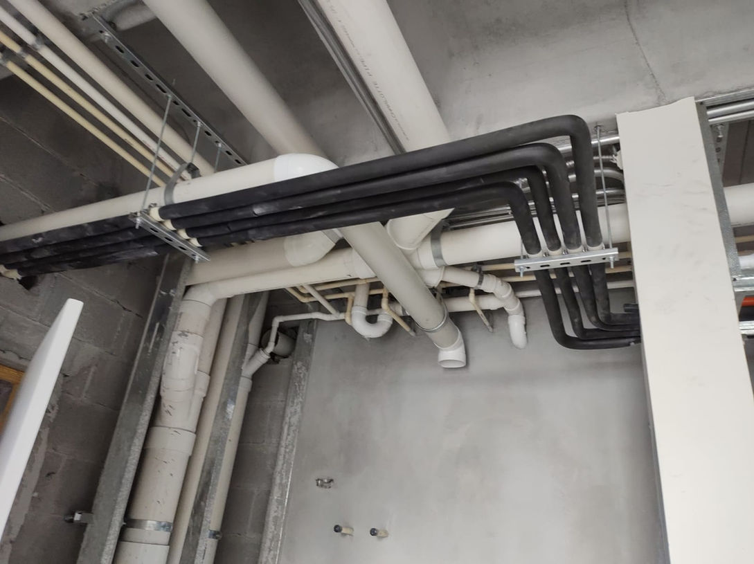 Instalación de tubería de refrigerante con soportes, sujeciones y aislamiento térmico.